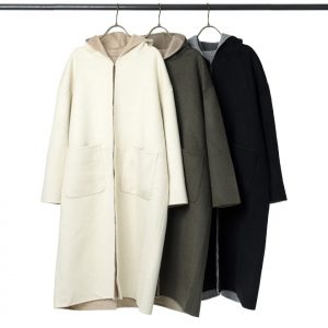 ウール100%のダブルフェイス素材のフーディーコートは、保湿性も高く、軽くて暖かいのが特徴。