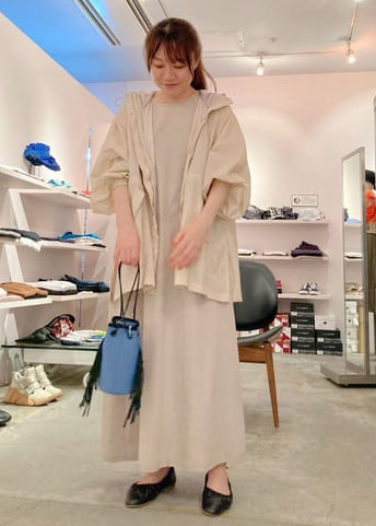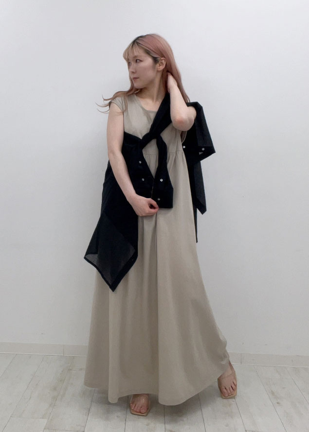 2wayノースリーブワンピースに、ポケッタブルブルゾンを重ねたベージュコーディネート。