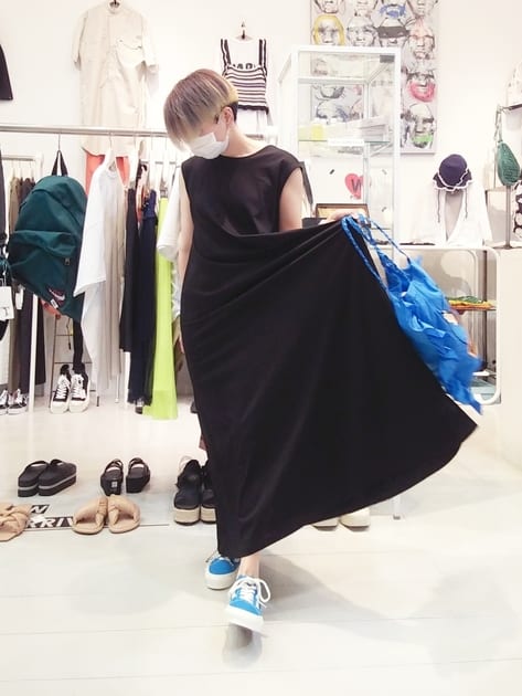 真っ黒なワンピースなので、 小物で差し色を入れるとカジュアルに。 靴とバッグでビビットなブルーを足してみました。