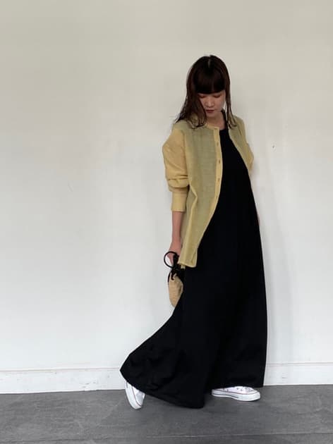 透け感のあるイエローのオーバーシャツが、ブラックワンピに軽やかさをプラスしてくれます。