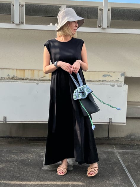 ブラックワンピースにブルー小物でアクセントを入れたカジュアルコーデネート