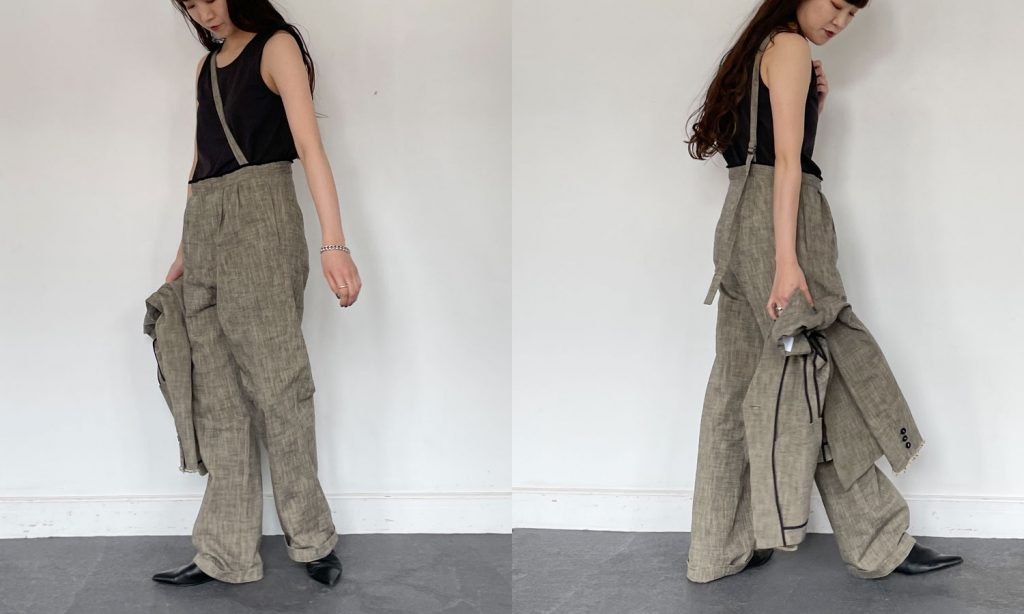 サスペンダーパンツでアレンジが出来るムラ染セットアップは、着こなしが楽しくなるアイテム!