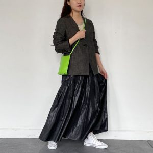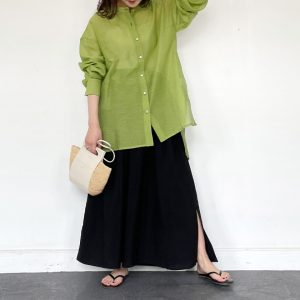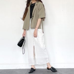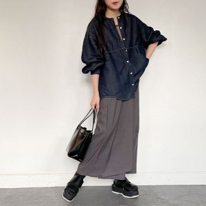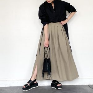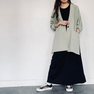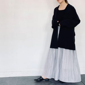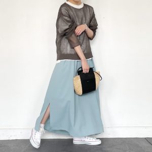 またロングスカ―トにはスリットがはいっているため、フラットシューズ合わせでも重たく見えず低身長さんにもおすすめしたいアイテムです。