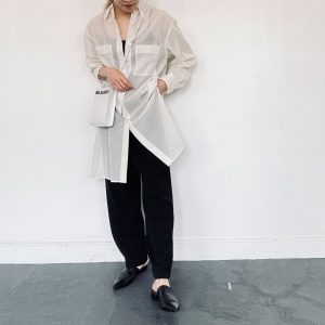 (右)トップス:ENTO サイドテープピンタックシャツ