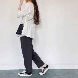 インナーはシンプルにホワイトで合わせた、チャコールカラーの大人きれいめセットアップコーディネート。