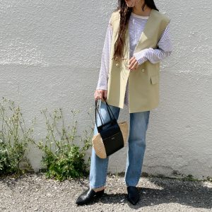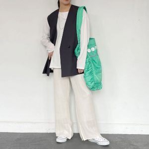 2022年春夏トレンドのノーカラーベストのセットアップコーディネート!