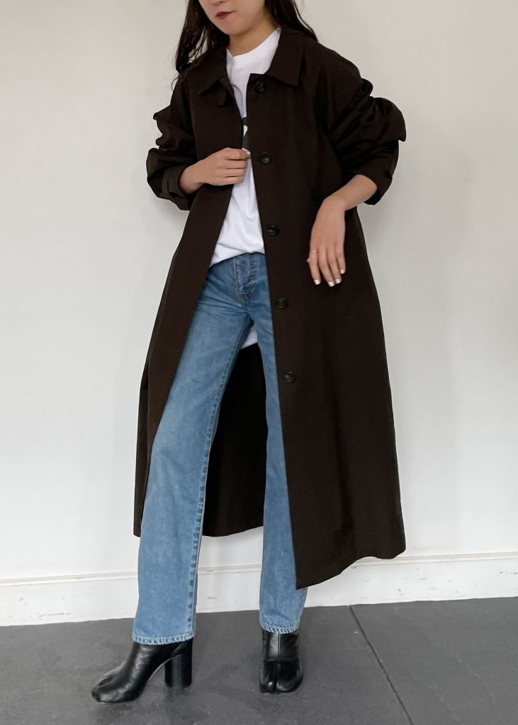 トレンチコート×デニムパンツのシンプルなスタイルも、スミクロカラーできれいめをプラス。