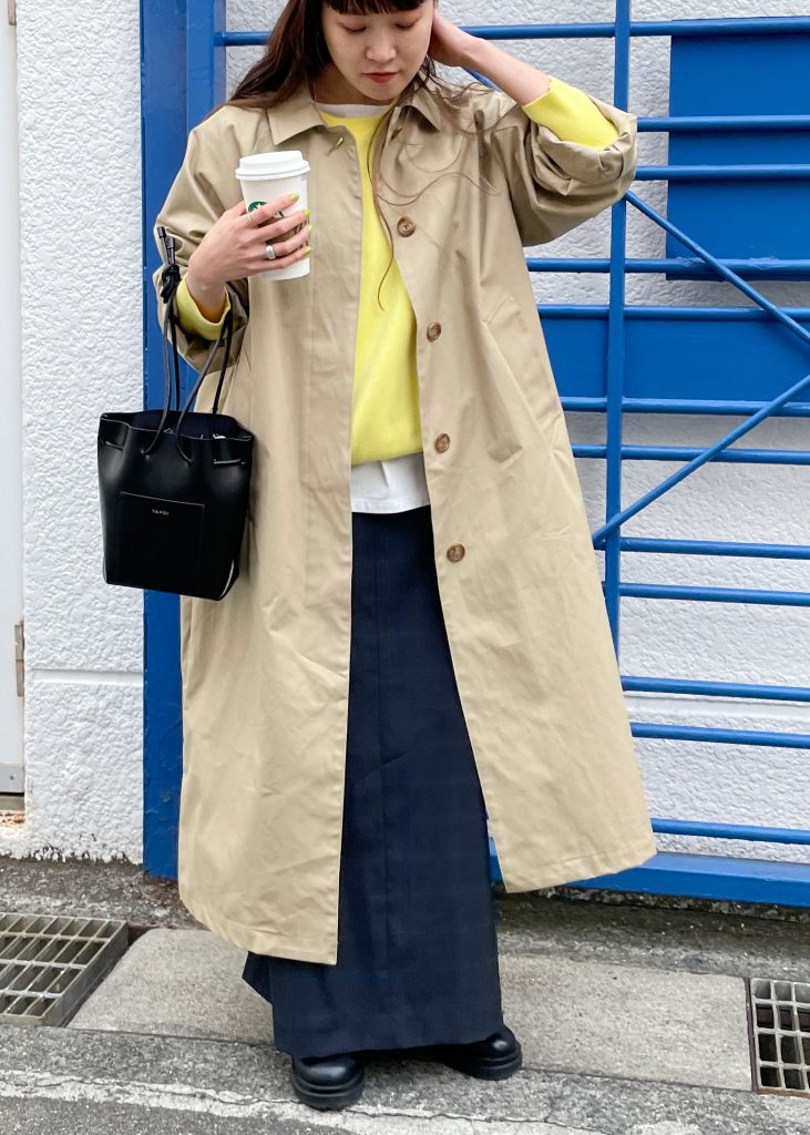 【レディースコーディネート2】定番のベージュカラーのトレンチコートも、イエローカラーのニットでこなれた印象に