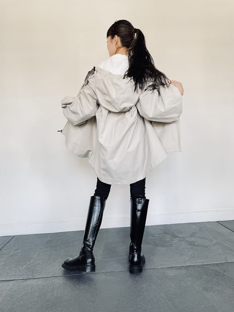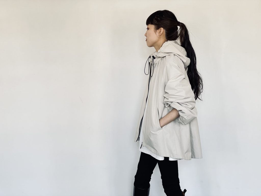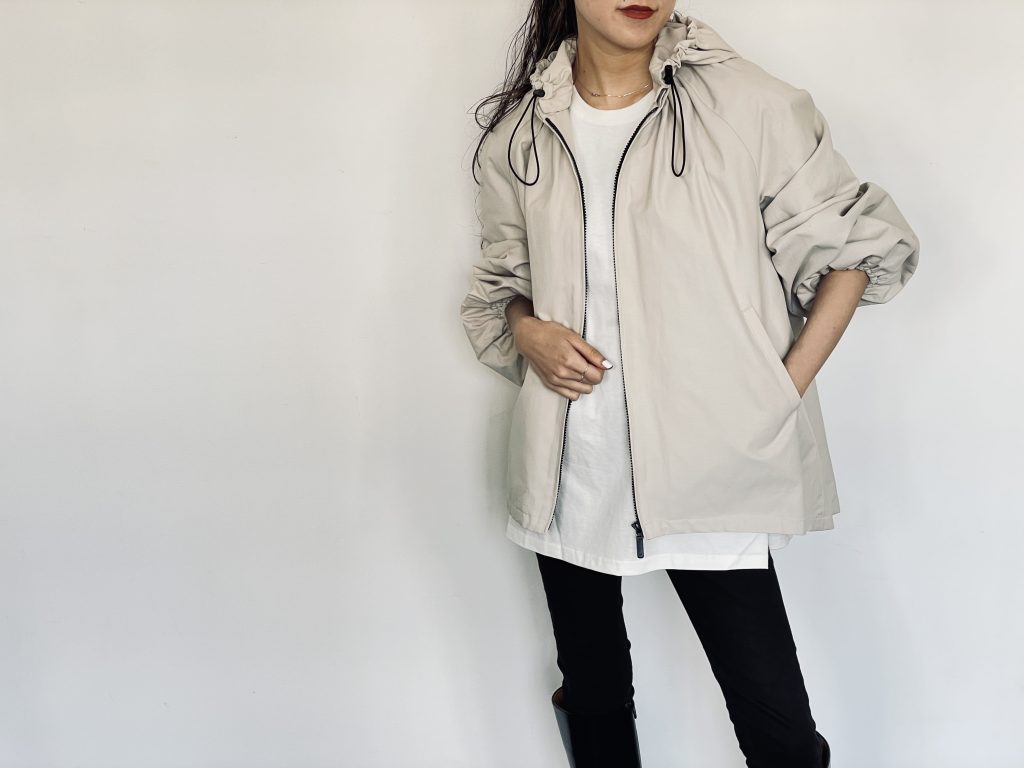 フレアーブルゾングレージュカラーには、フードゴムとファスナーをブラックに仕上げました。