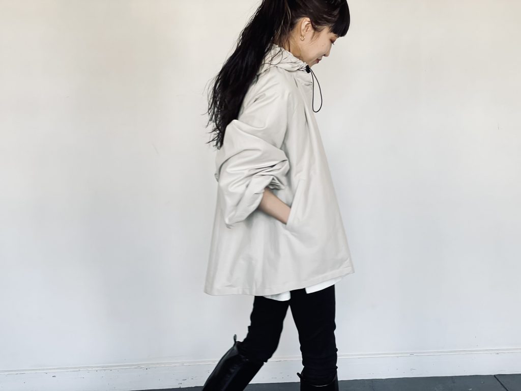 マットな生地感やフードのゴム、ファスナーなどの部品は少しスポーティーにしたのがポイント。