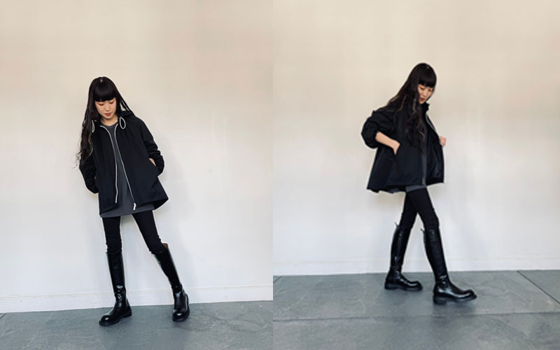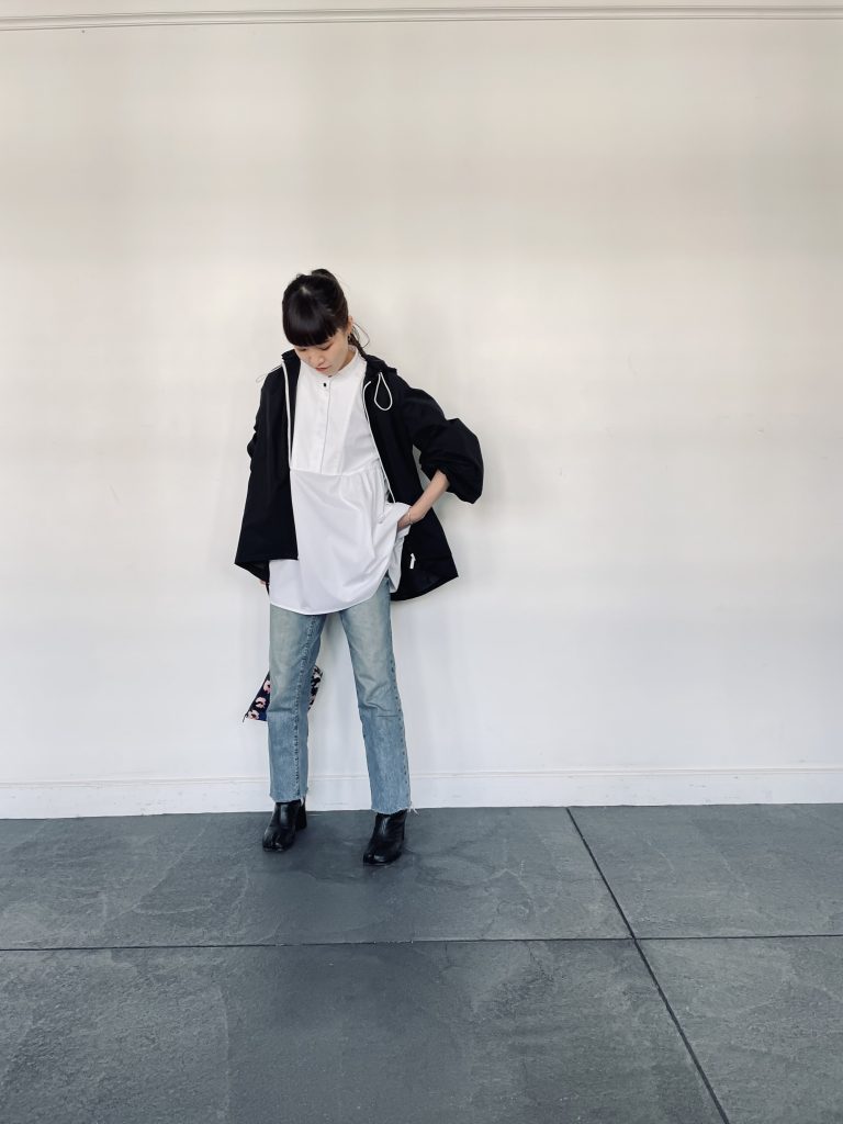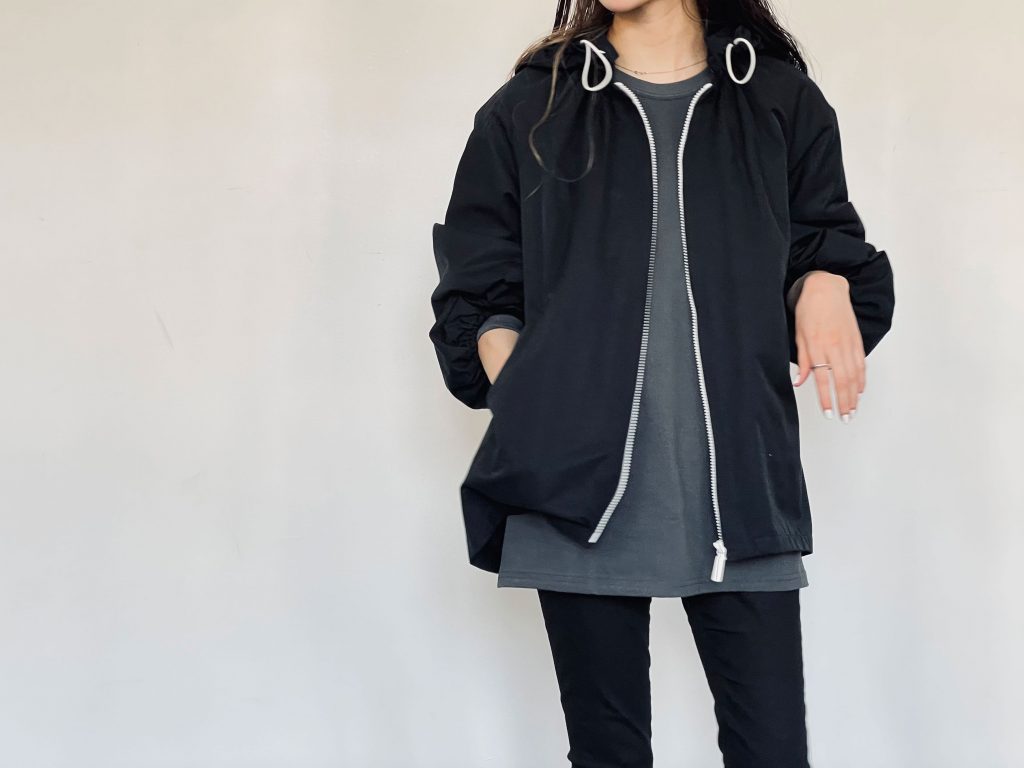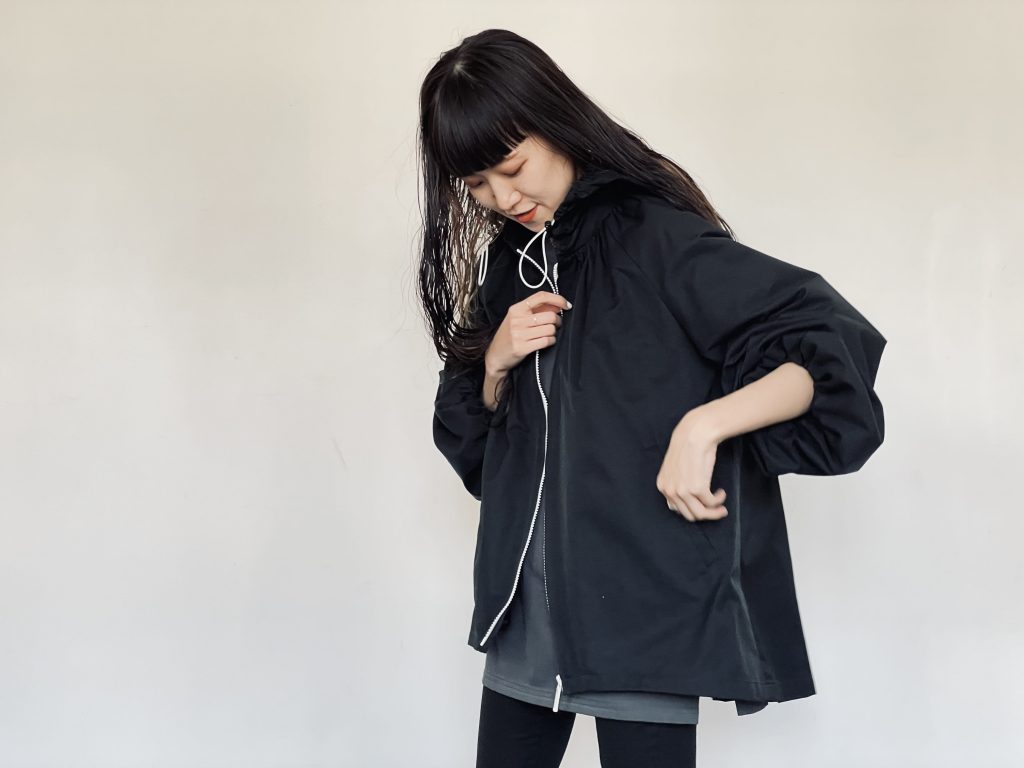 フレアーブルゾンブラックカラーには、フードゴムとファスナーをホワイトに仕上げました。
