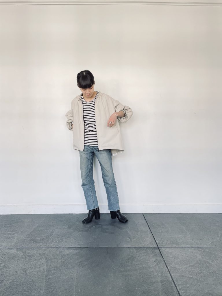 ボーダー×デニムパンツのカジュアルコーデでも、グレージュカラーのブルゾンをノーカラーにして羽織ることで上品な印象を与えてくれます。