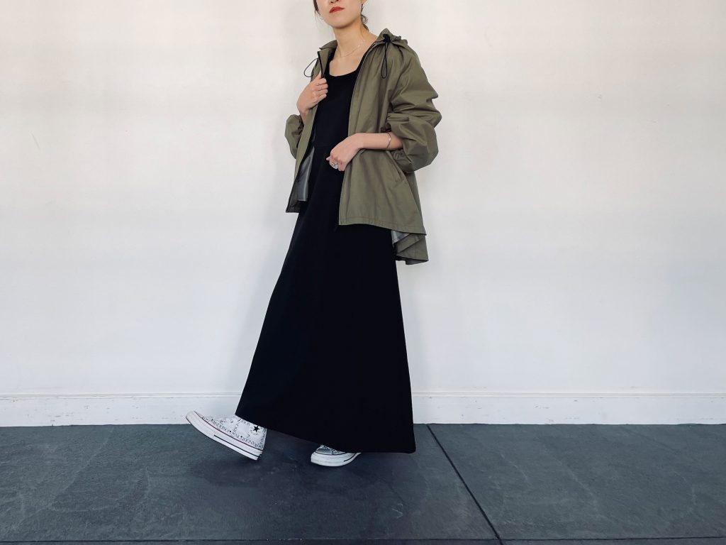 カーキ×ブラックコーデは、クールで大人っぽい印象ながらも、フード有りでワンピースと組みわ合わせることで可愛さをプラス。