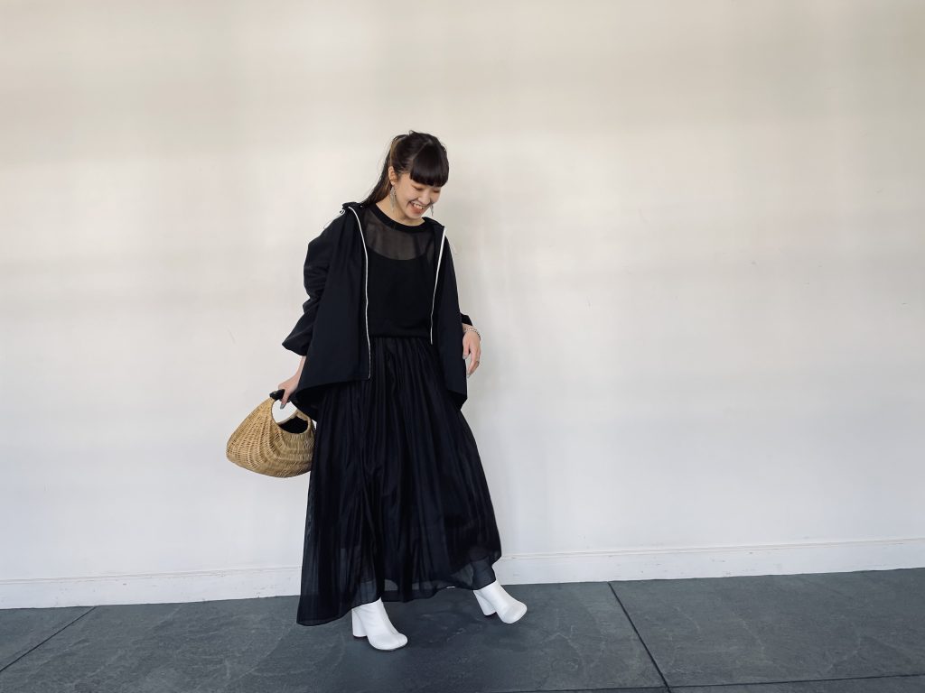 オールブラックコーデですが、メッシュや透け感などの異素材の組み合わせをすることで軽やかさをプラス。