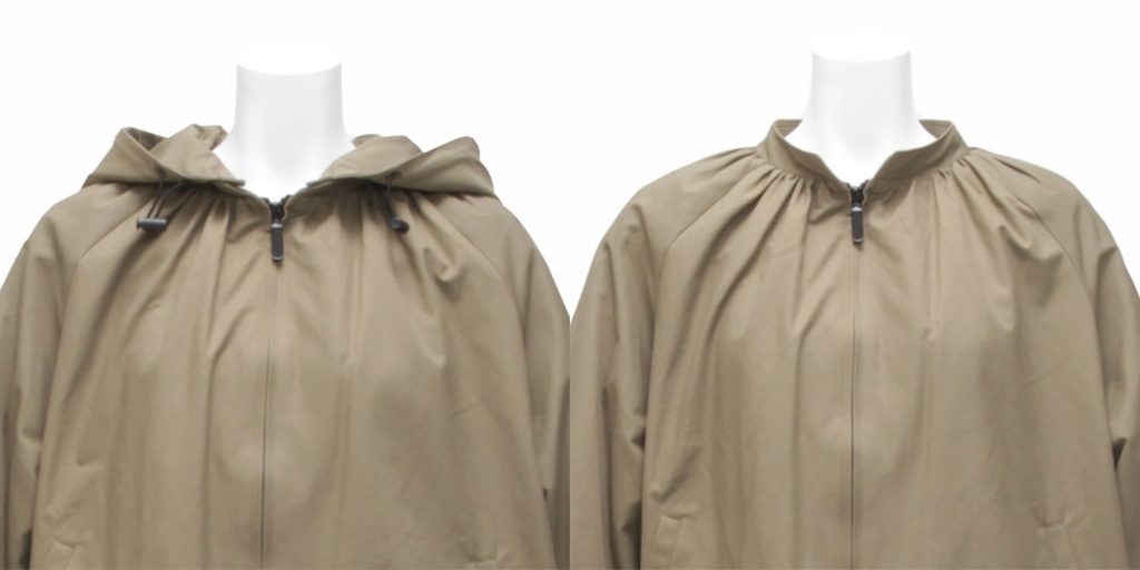 フード無しは、ノーカラーブルゾンになり首元がすっきり見え上品な印象に。
