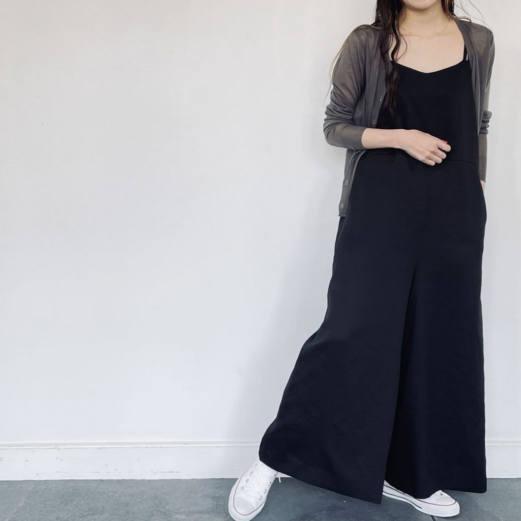 緩めのオールインワンにカーディガンを合わせたリラックススタイル。