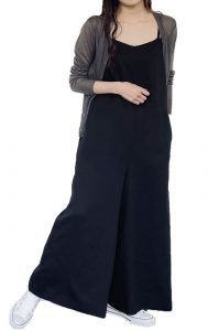 緩めのオールインワンにカーディガンを合わせたリラックススタイル