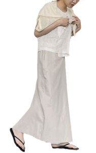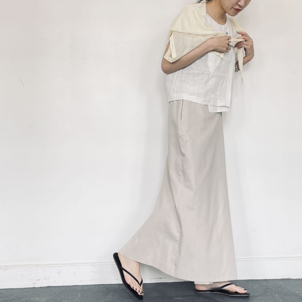 麻トップスと綿麻スカートの夏らしい爽やかな組み合わせに、色も淡色でまとめた大人のきれいめコーディネート。