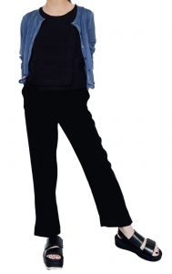 オールブラックコーデですっきりとまとめ、透け感のあるブルーカーディガンを差し色使いでコーデにメリハリを。