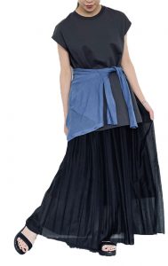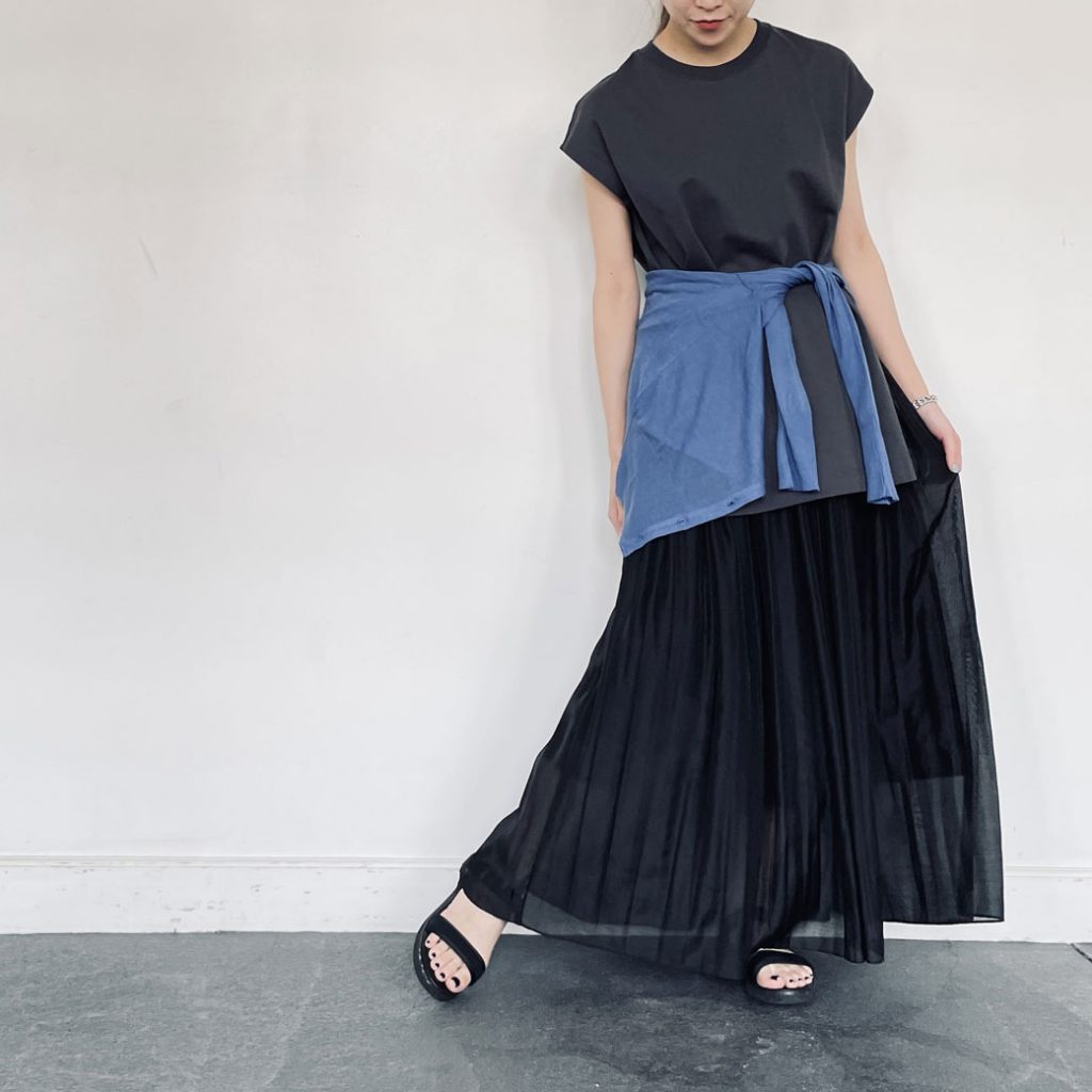 チャコール×ブラックのシンプルなモノトーンコーデに、ビビットブルーを腰に巻いてコーデのアクセントに。