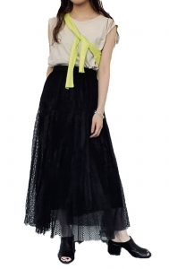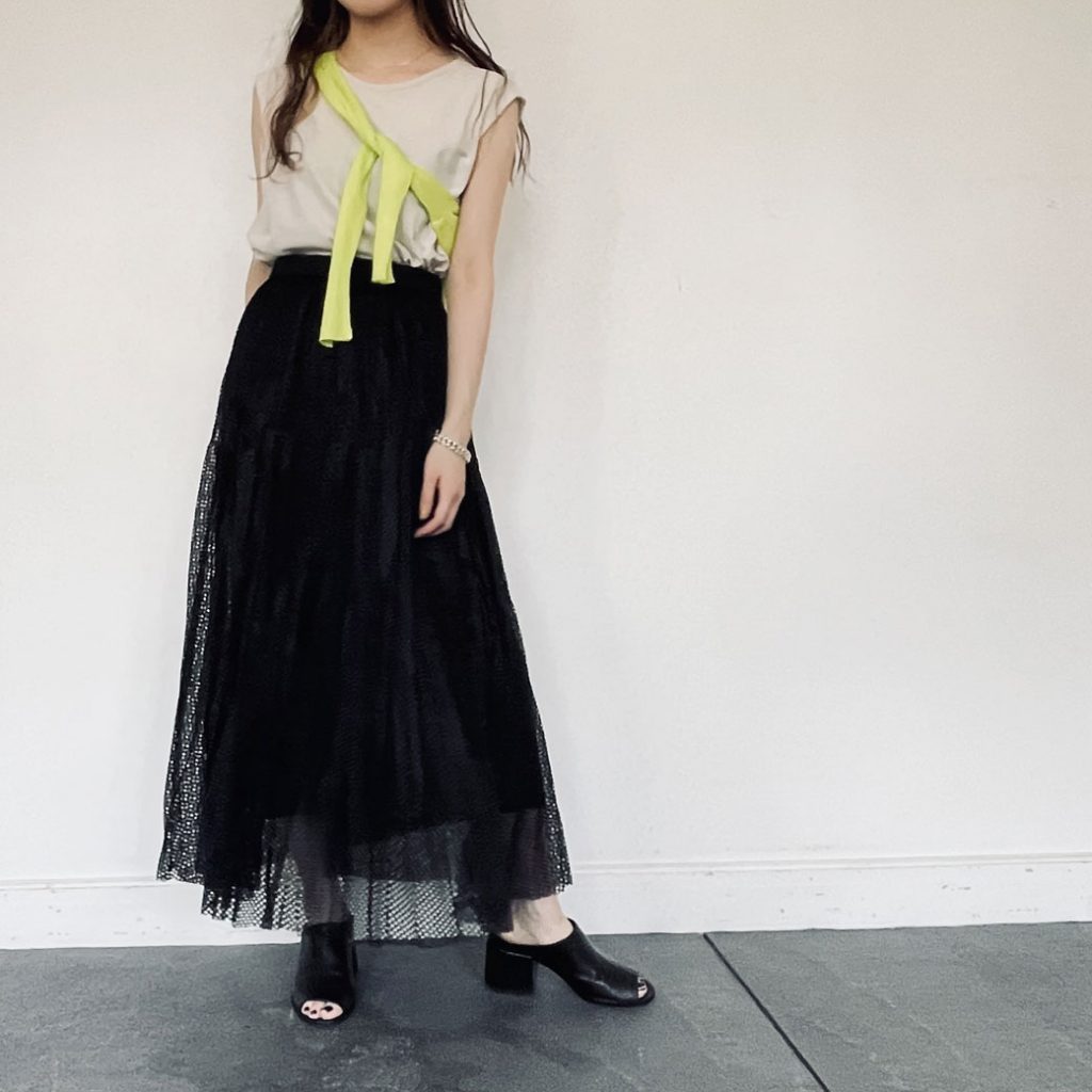 シンプルなベージュトップスにメッシュ素材が可愛いプリーツスカートを合わせて大人可愛いコーデに。