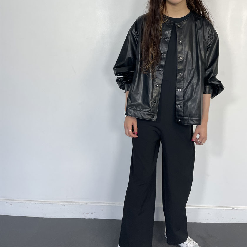 落ち感のある素材とすっきりとしたシルエットのオールインワンに、エコレザーブルゾンを合わせた大人のきれいめスタイルに。