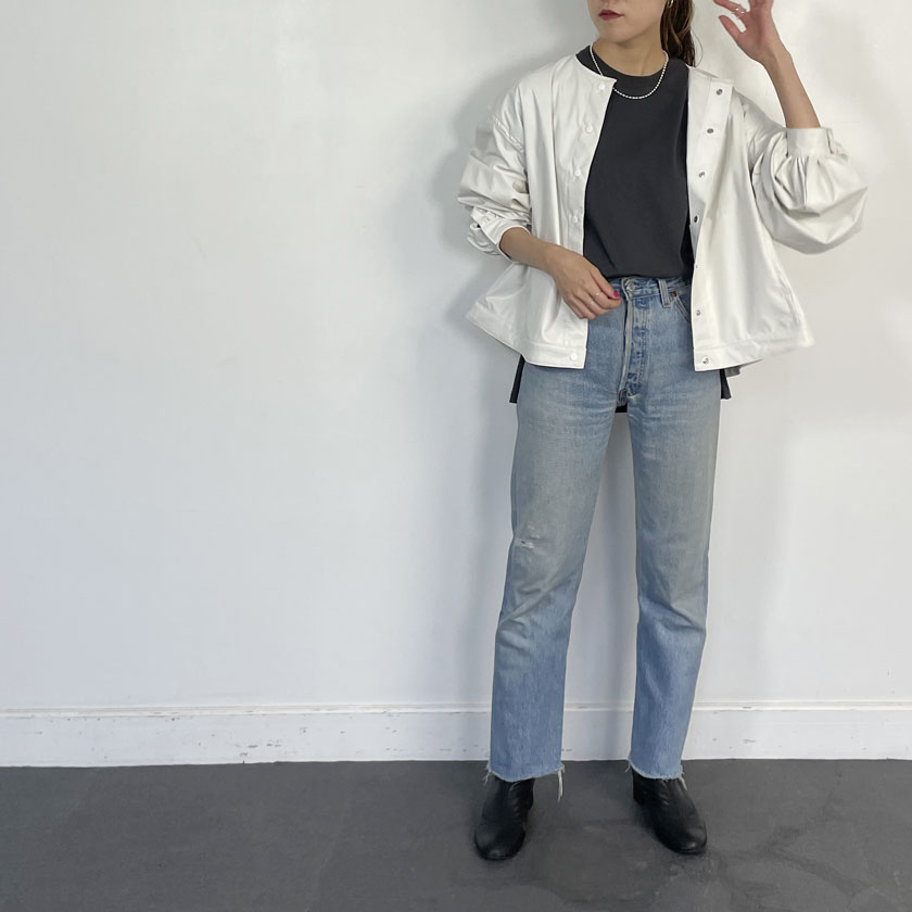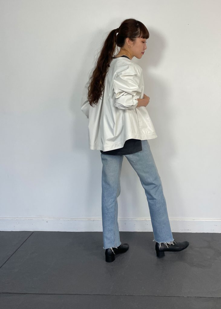 ホワイトカラーのエコレザーブルゾンに、デニムパンツを合わせてラフに仕上げたのがポイント。