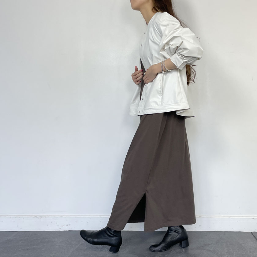 シンプルなデザインのワンピースに、ホワイトカラーのエコレザーブルゾンを合わせてコーデにアクセントを。