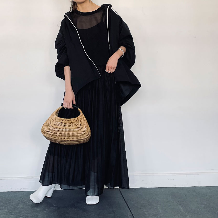 オールブラックコーデですがトップスはメッシュ素材、スカートはオーガンジー素材などで、素材感の違うものを組み合わせることで軽やかな印象に仕上げました。