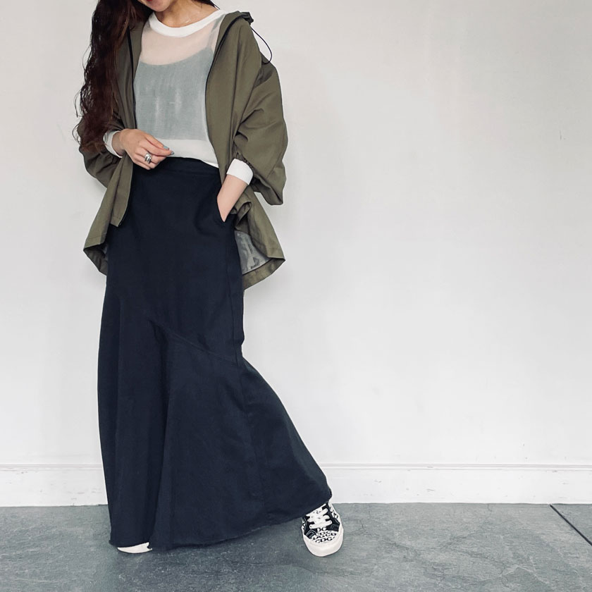 デニムのAラインスカートに、メッシュトップスからキャミソールを透かした遊び心あるスタイルに、カーキのブルゾンを羽織ることで少しスポーティーに外したコーディネート。