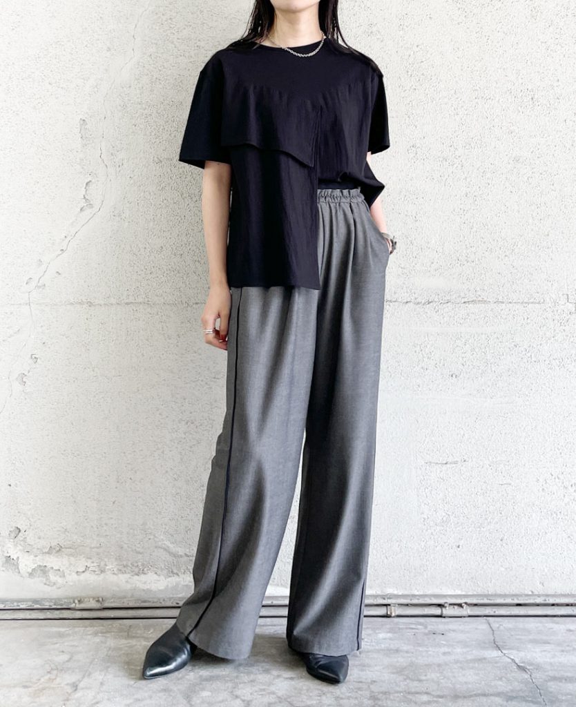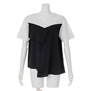 アシンメトリーな切替デザインと異素材づかいが特徴。