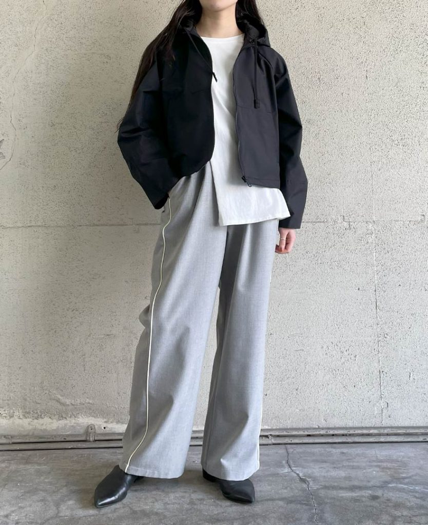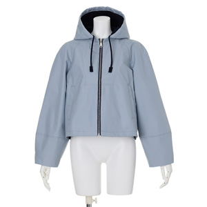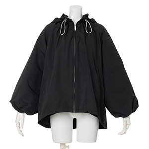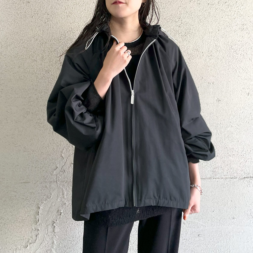ボリューム袖やたっぷりのフレアーシルエットで可愛さを引き出しつつ、マットな素材感や立ち上がりフードでスポーティーな印象も。