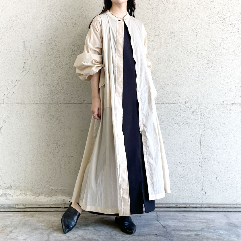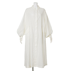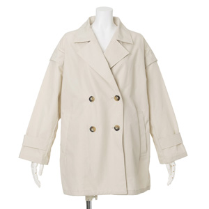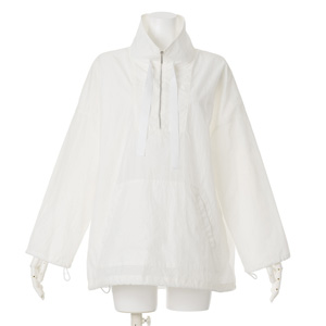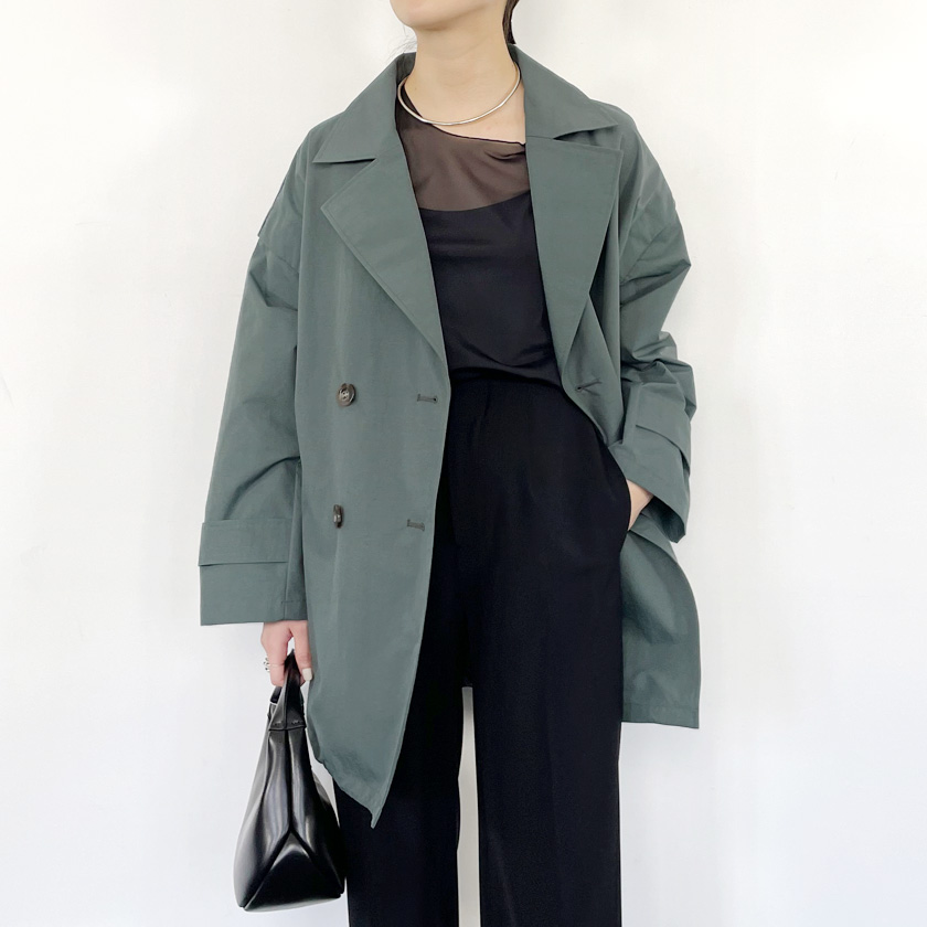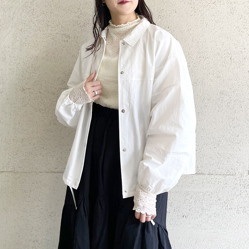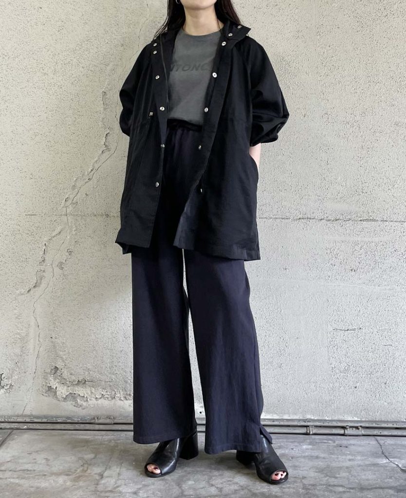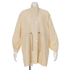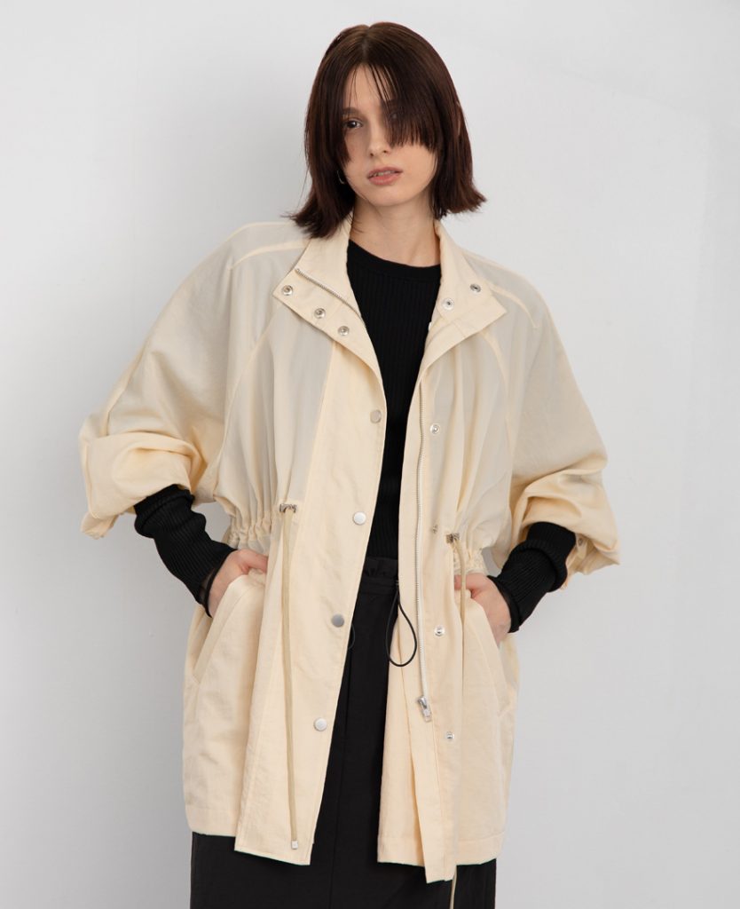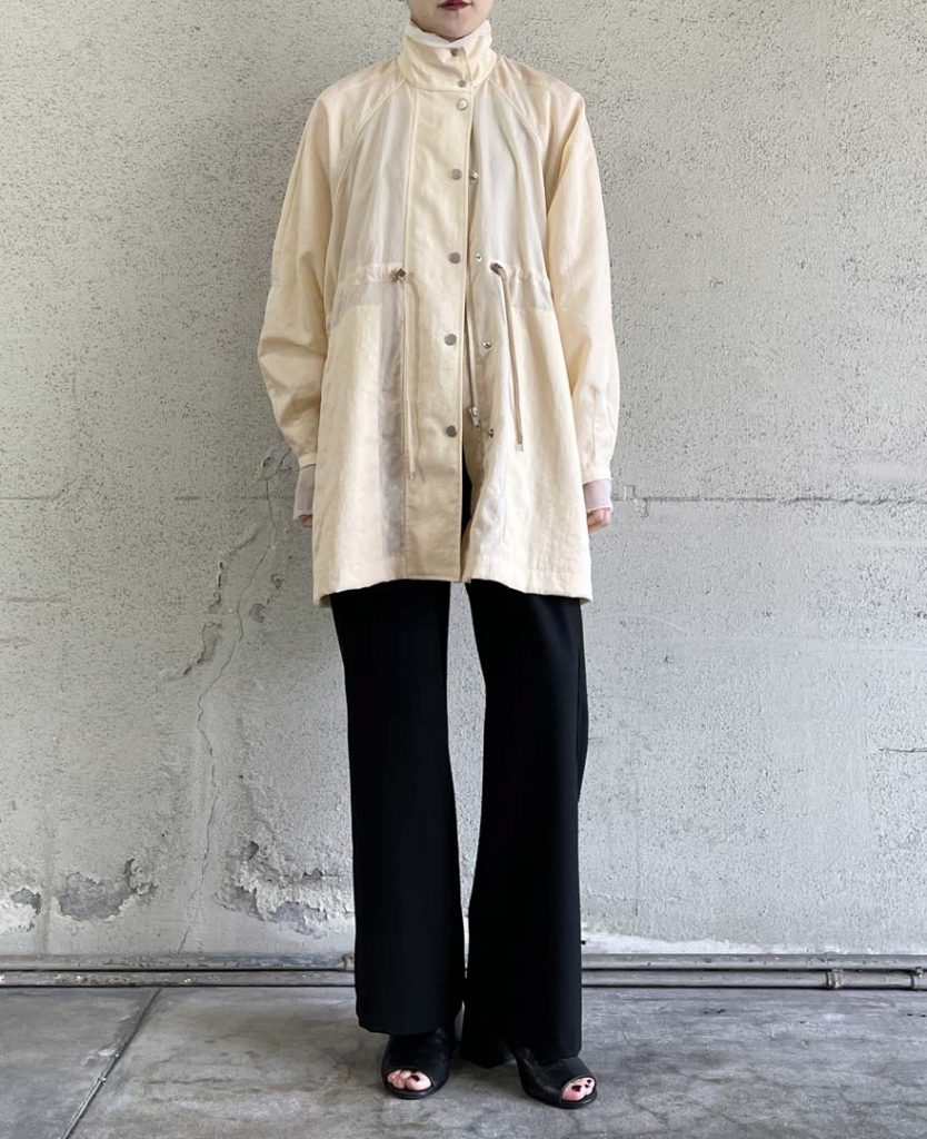 使いやすいミドル丈で、ウエスト部分を絞ってシルエットにメリハリをつけたり、スタンドカラーにしたりと、紐とスナップボタンでアレンジできます。