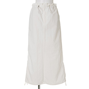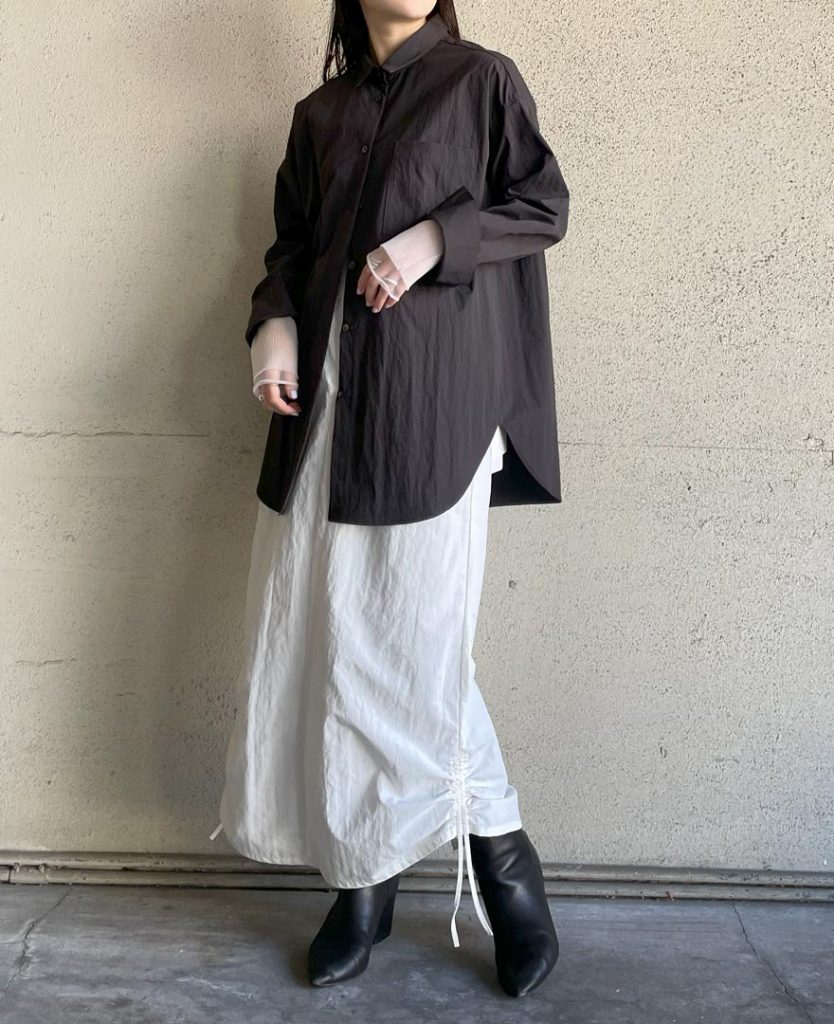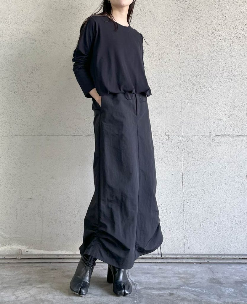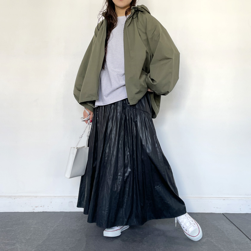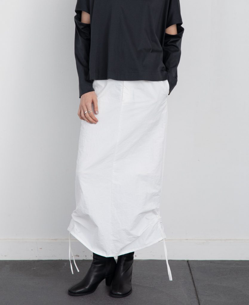 ハリ感のある軽い生地を使用し、裾部分のギャザーでシルエットの変化を楽しめます。