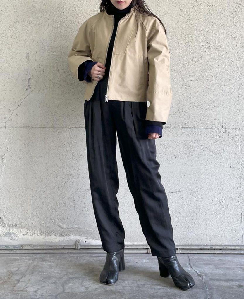 衿元はスタンドカラーにしたりファスナーを開けて折り曲げたり、袖口や裾を絞って着丈やシルエットを変えたり、