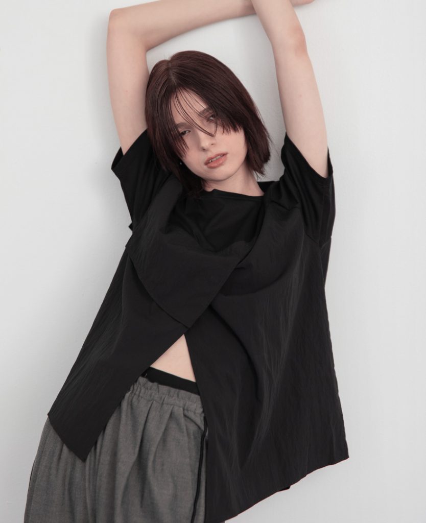 異素材部分に撥水加工を施しており、嬉しいUVカットも兼ね備えた高機能なデザインカットソー。