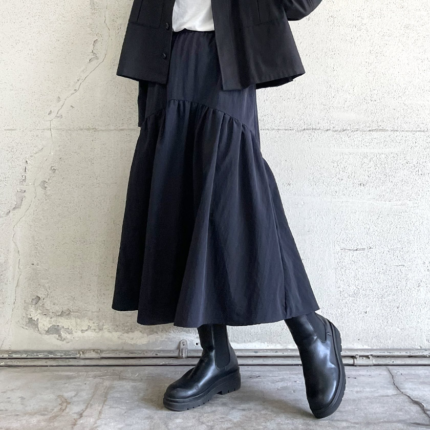 肩周りが目立ちやすい骨格ナチュラルさんは、生地をたっぷり使用したドレープ感のあるロングスカートで重心を下げて。