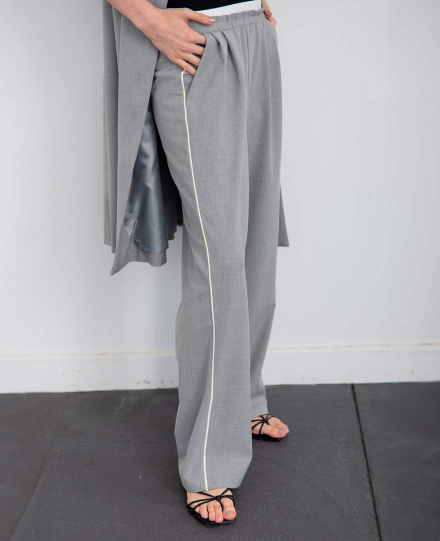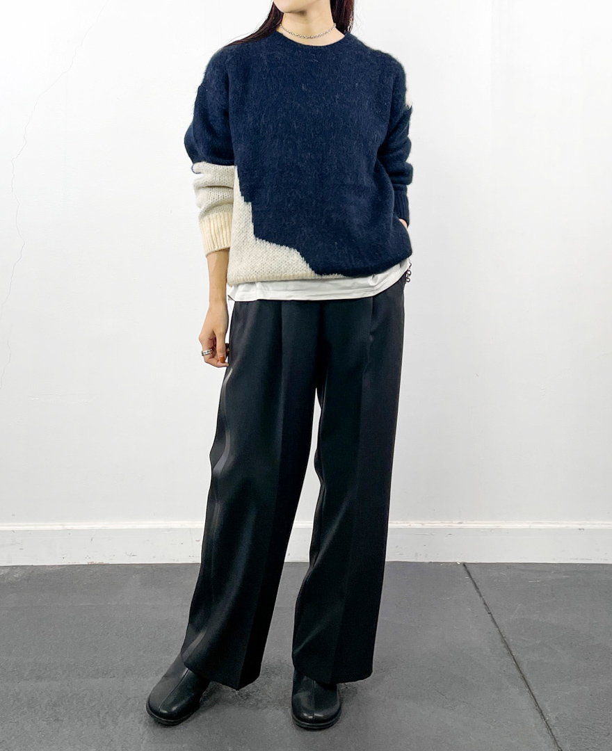 | tops / シャギージャカード柄ニット | pants / サイドテープデザインパンツ |