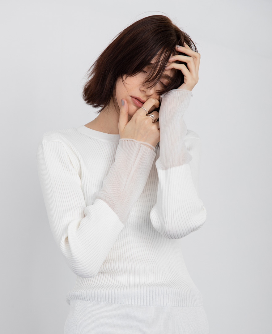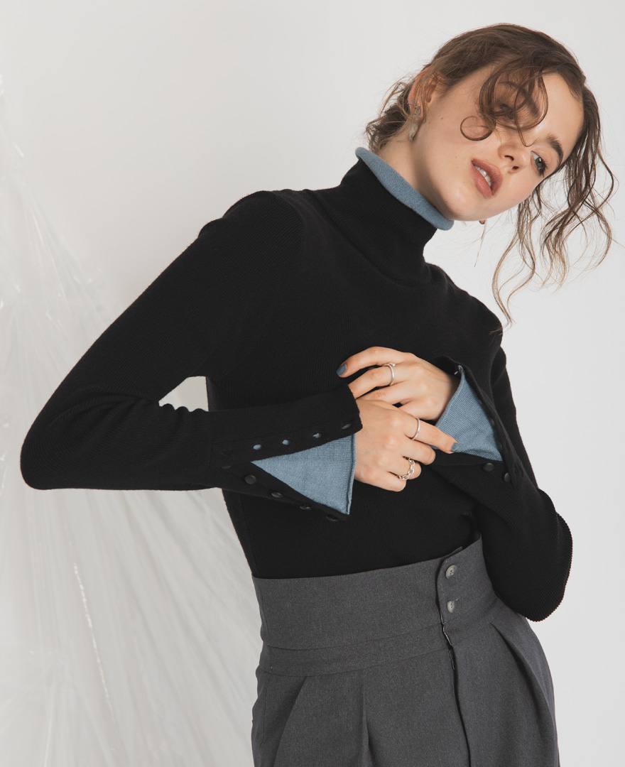 鎖骨の見えるネック以外にハイネックも似合い、袖はフレアなシルエットを。