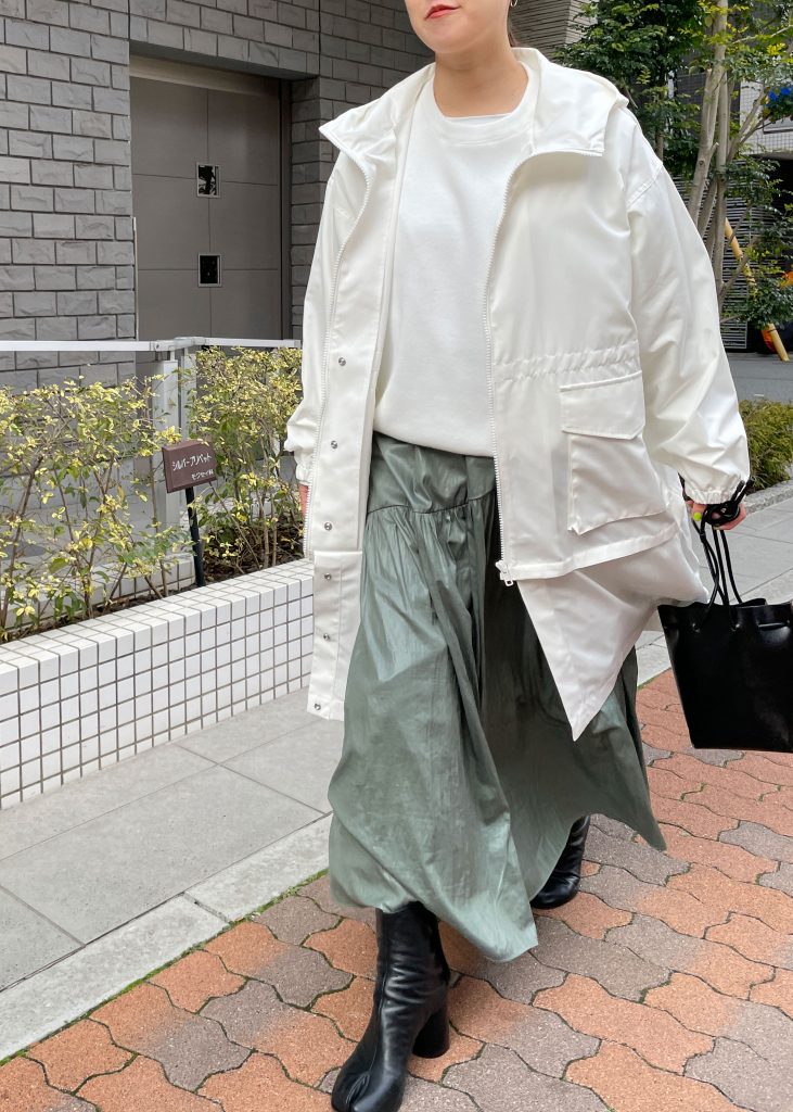ホワイトカラーのマウンテンパーカーにサテン素材のタイトスカートを合わせた、大人のきれいめカジュアルコーディネート。