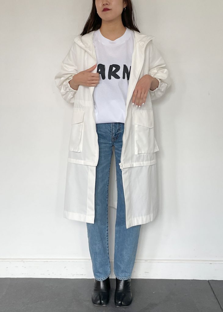 ホワイトカラーのマウンテンパーカーをロング丈で着用し、MARNIのロゴプリントロンTにデニムパンツを合わせたシンプルなカジュアルコーディネート。