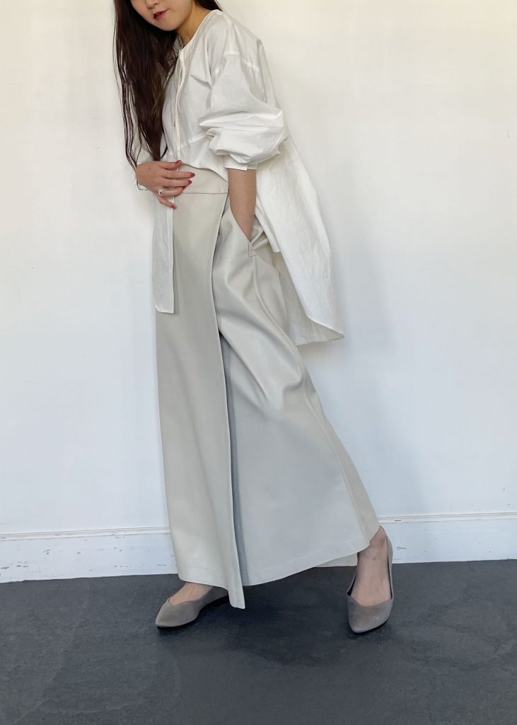 キレイめな雰囲気ながら、ノーカラーのデザインやレザー使い、フラットシューズで程よく着崩したのがポイント。