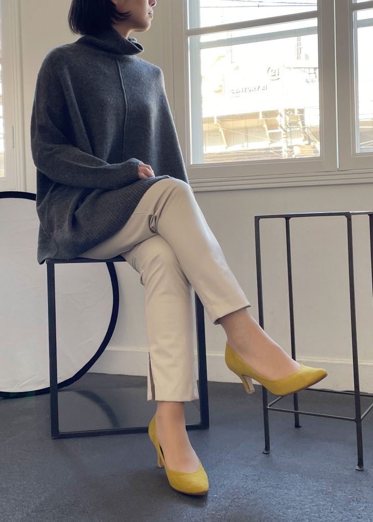 スエード調素材のパンプスならイエローカラーでも上品に馴染みオフィスコーデにも◎