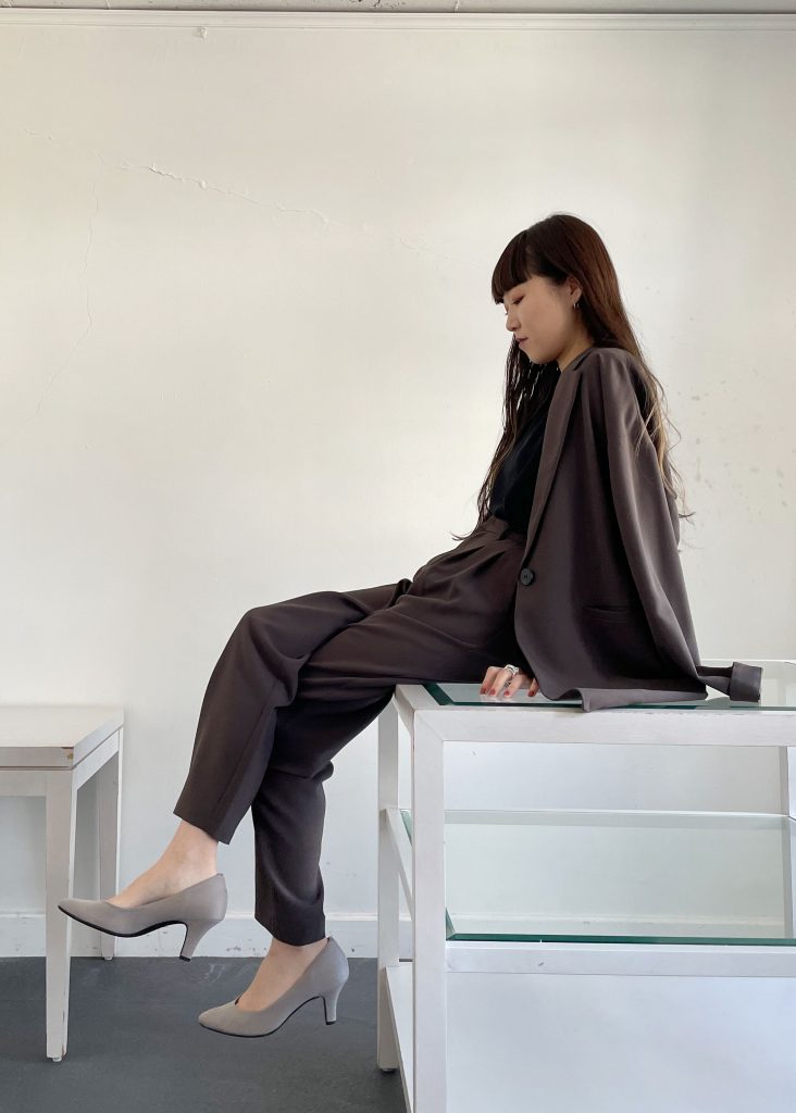 1.チャコールカラーのセットアップ×グレージュパンプス