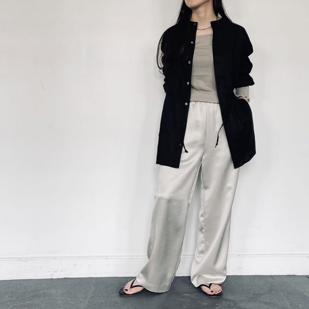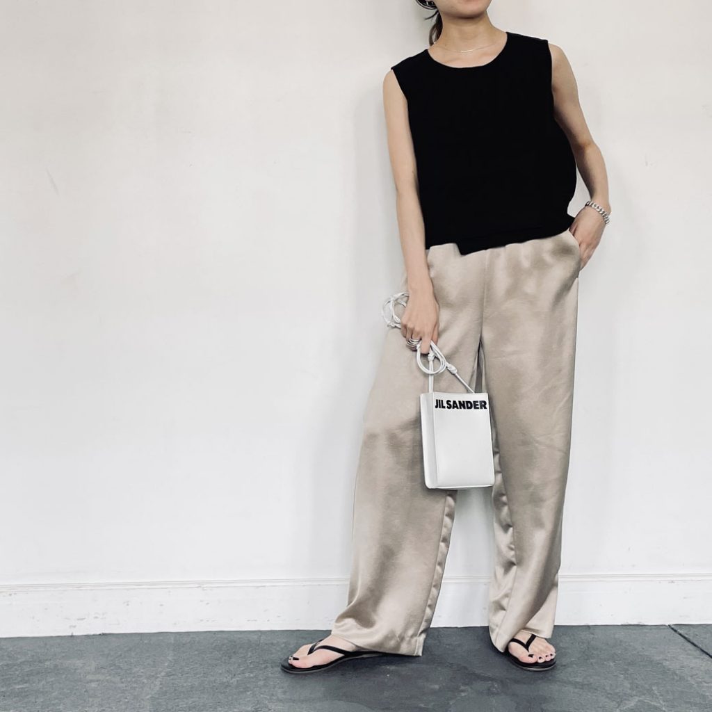リネン素材のコンパクトなノースリーブに、緩めのサテンパンツ合わせでバランスをとったコーディネート。
