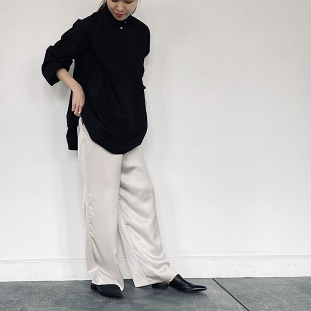 サテンワイドパンツにきちんと見えするように、スタンドカラーのシャツを合わせたオフィスカジュアルスタイル。