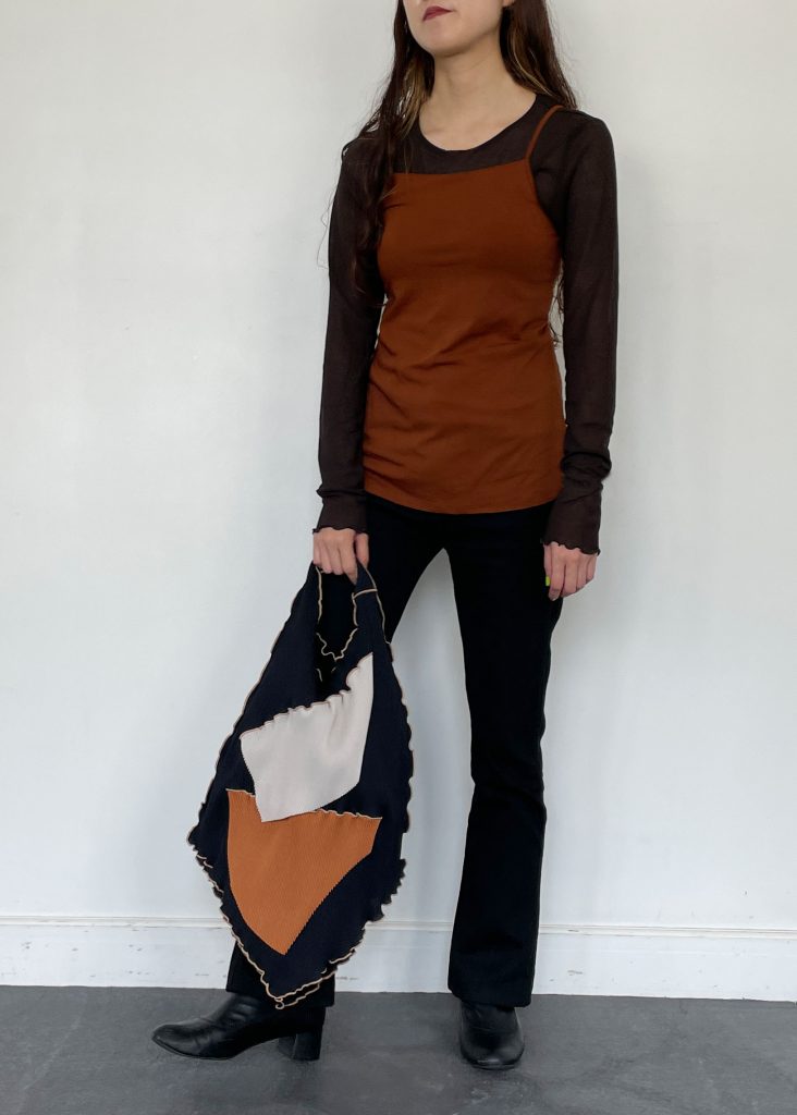 【ブラック×ブラウン】キャミソールを重ね着したきれいめカジュアルコーディネート