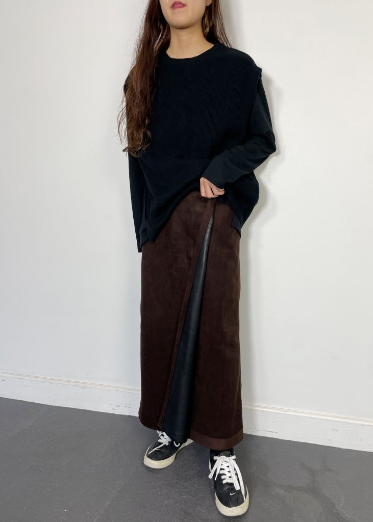 2021年秋冬トレンドのワッフルニットベストにロンTを重ね着して、スエードスカートにスニーカーを合わせて程よくラフに組み合わせたカジュアルコーディネート。