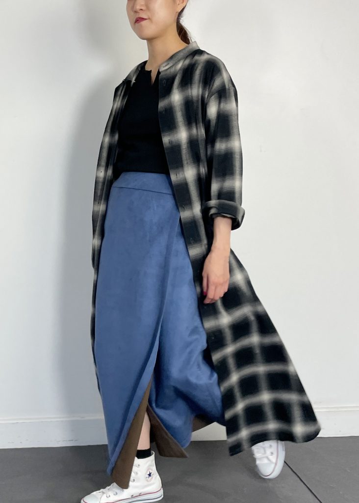 チェック柄のロングシャツに、ブルーのスエードスカートを合わせた大人のカジュアルコーデネート。