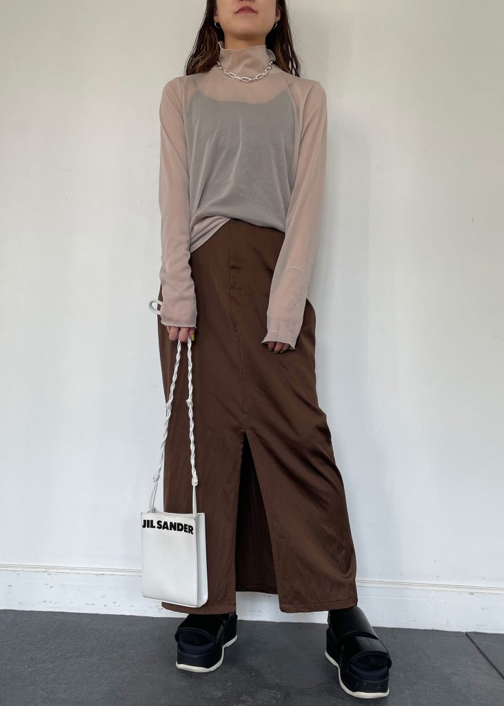 透け感が可愛いシアーメローハイネックに、タイトめなサテンスカートを合わせた大人のきれいめコーディネート。
